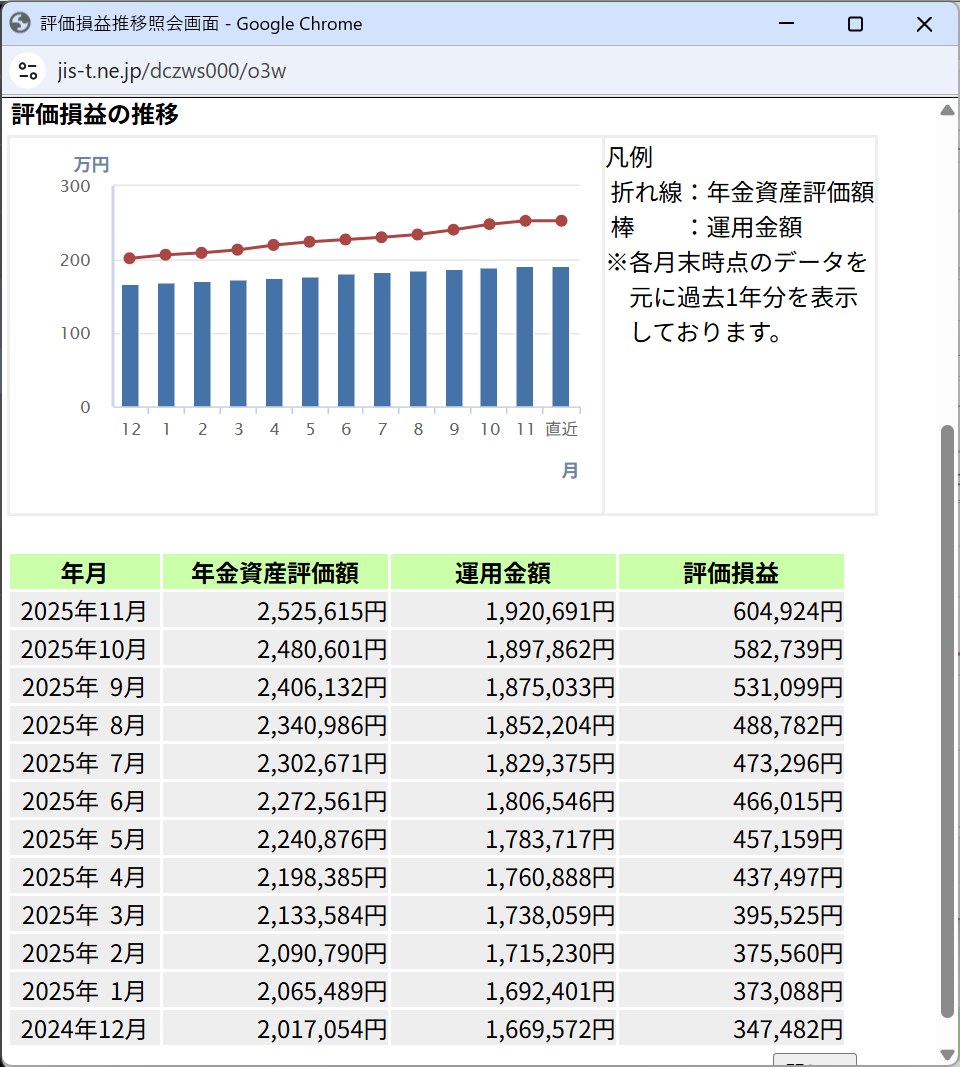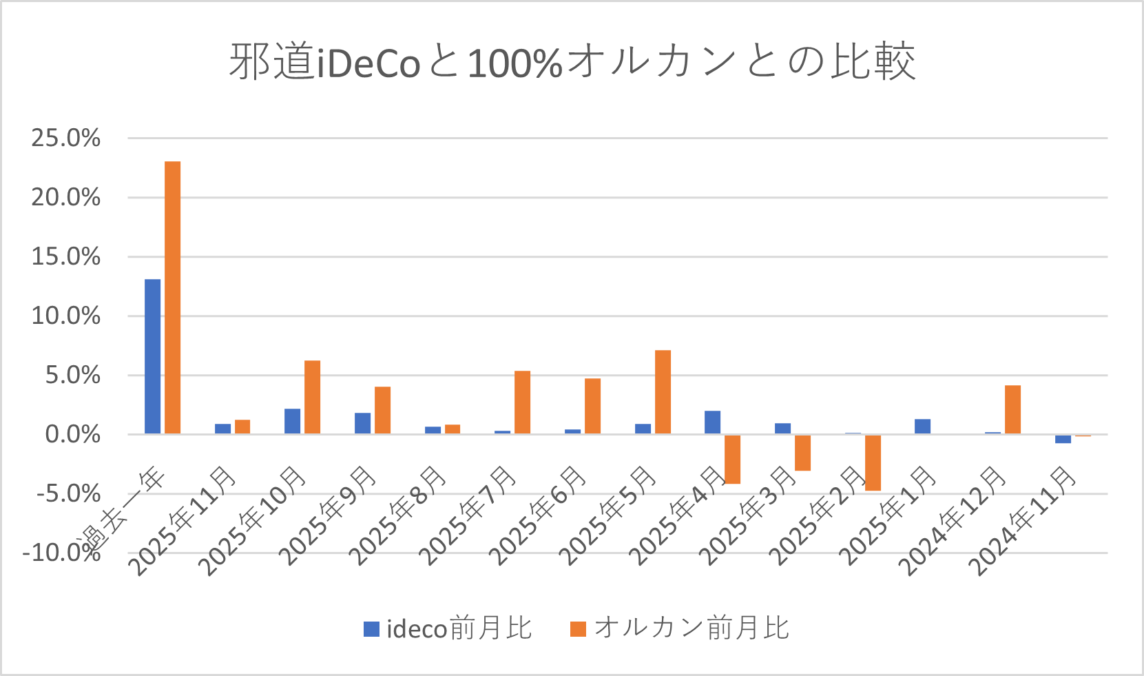 ideco運用-2025年11月末時点 2025.12.04 ideco 投資 閲覧数:3 Post Share LINE 2025年11月末時点での私のideco運用実績と全額オルカンで運用した場合の比較です。 2025年11月は邪道+0.9%に対して、オルカン1.2%でした。 11月は待ちに待った調整が始まり、今月こそオルカンに勝つか?と思ったのですが、月末にかけ相場が回復。また、円相場も月初に比べ円安となったことから、オルカン有利に働きました。 引き続き、株価調整や円高リスクに備えて、株式等のリスク資産ポジションは低めにしています。11月末時点で定期預金が83%です。 にほんブログ村 社長 記事一覧 X Post Share LINE